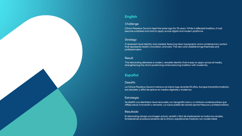 El rebranding para la Clínica Perpetuo Socorro representó un punto de inflexión para una institución médica con más de cuatro décadas de historia. Su identidad visual original, aunque reflejaba tradición y confianza, se había quedado rezagada frente a las nuevas exigencias del entorno digital y la comunicación moderna.
